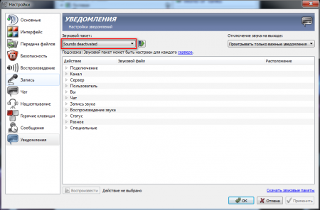 Звуковой пакет Default Sound Pack меняем на Sounds Deactivated и перезаходим в тимспик