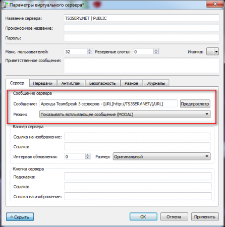 Нажимаем правой кнопкой по серверу » Параметры виртуального сервера » Сообщение сервера